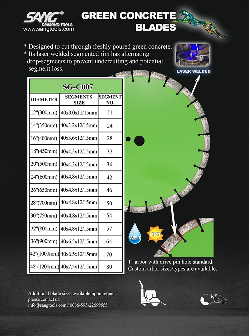 شفرة القطع الخضراء SANG – مصممة خصيصًا للمناشير ذات الاستخدام المبكر مع مصفوفة رابطة ناعمة للتعامل مع تآكل الخرسانة الخضراء.