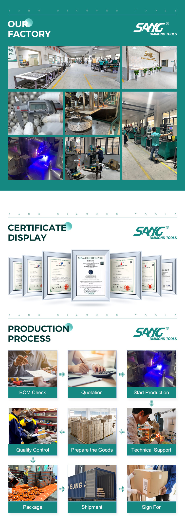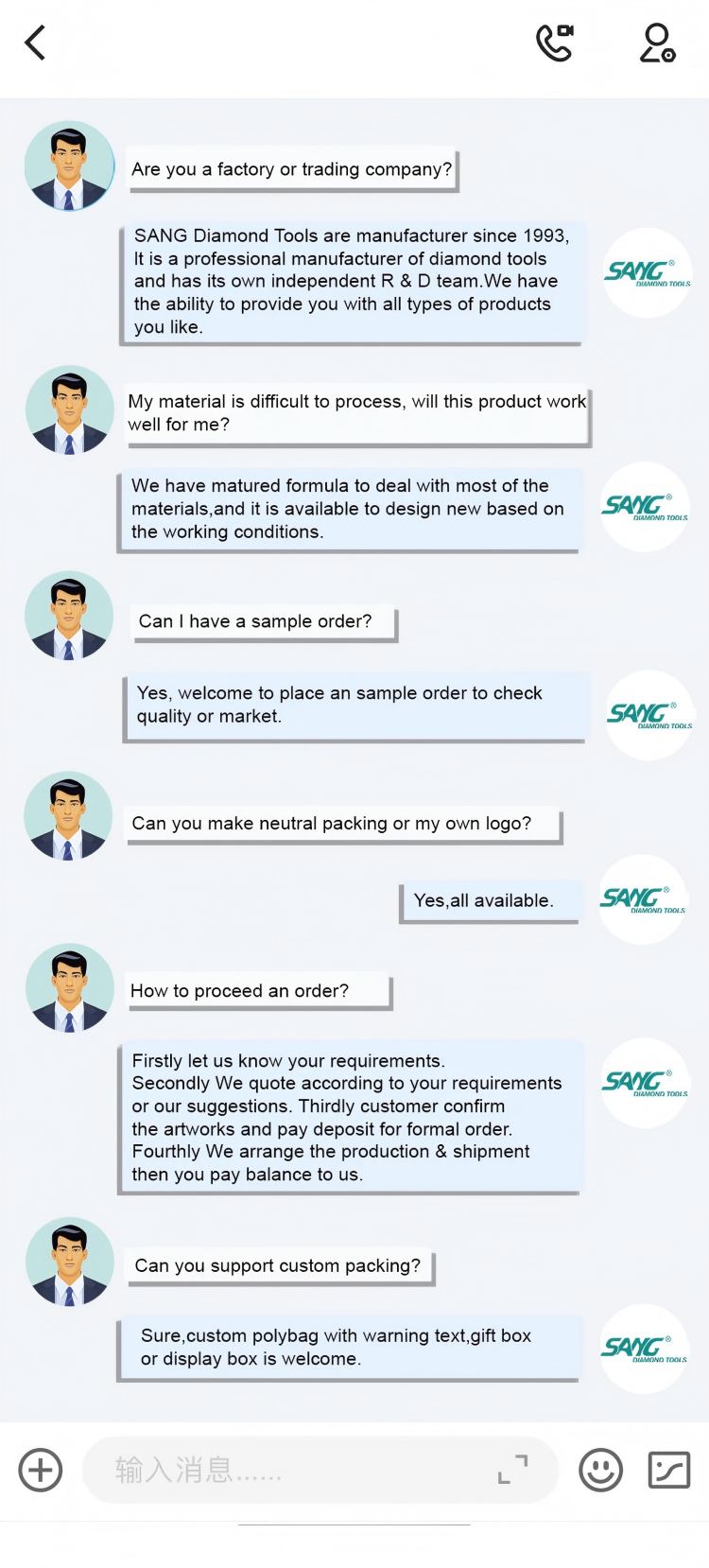 في شركة SANG Diamond Tools، نقدم خدمات تصنيع المعدات الأصلية (OEM) وتصميمها (ODM) المصممة خصيصًا لتلبية متطلبات آلاتك وعلامتك التجارية. تواصل معنا اليوم للحصول على عرض سعر أو كتالوج أو عينة.